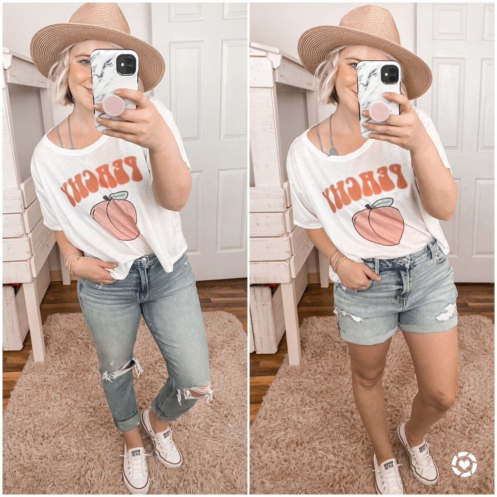 I have styled 5 tops in an outfit spring geared and one that’s a bit more summery! I am big on finding good key pieces to my wardrobe, and fun accessories to mix and match outfits! My MUST haves are a few good pairs of high waisted jeans and shorts (distressed is my jam!), hats, wrap bracelets, simple rings, and statement earrings! It makes it easy to take a core clothing item and build many outfits with it.