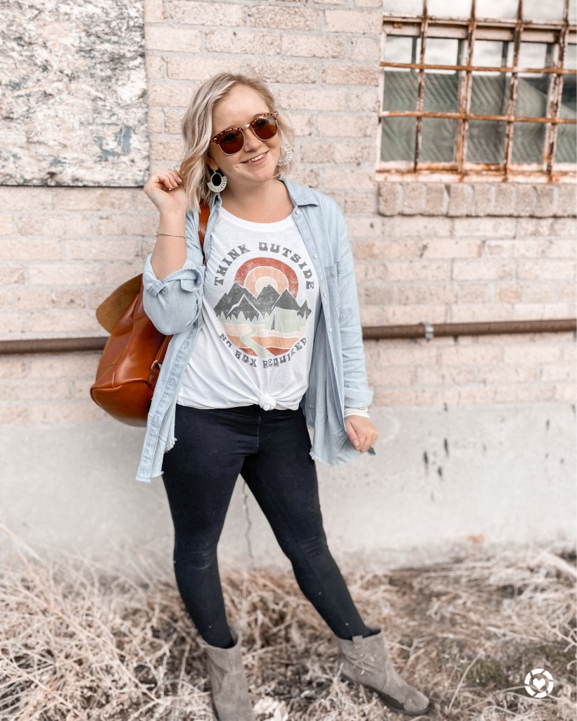 Graphic Tee // Chambray Shirt // Leggings // Boots- similar HERE // Bag // Earrings // Knot Bracelet // White Bracelet // Sunglasses