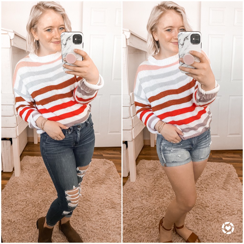 Sweater // Jegging // Shorts // Bootie // Sandals- similar HERE // Bracelet // Earrings