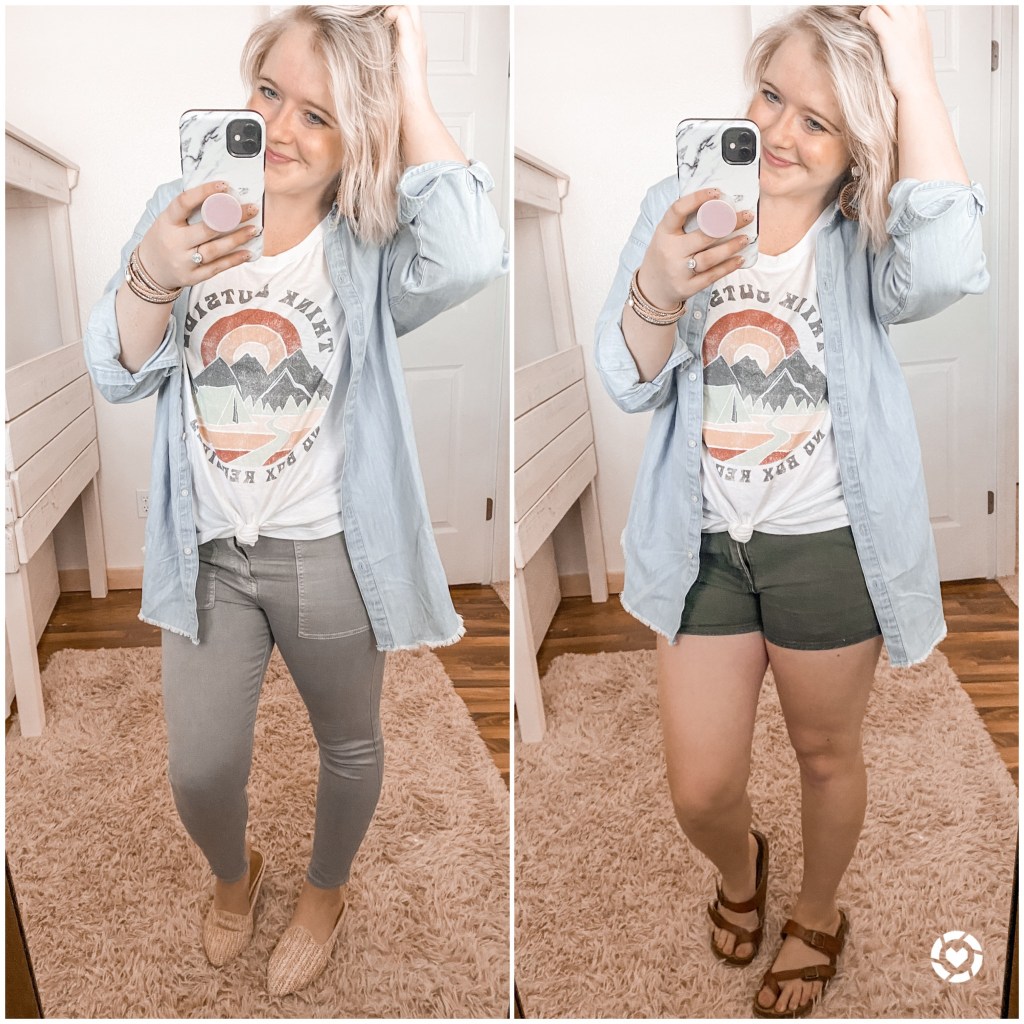 Tee // Chambray Shirt // Jegging // Shorts- similar HERE // Mules // Sandals // Bracelet