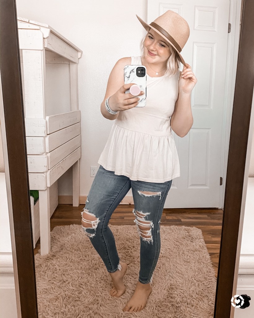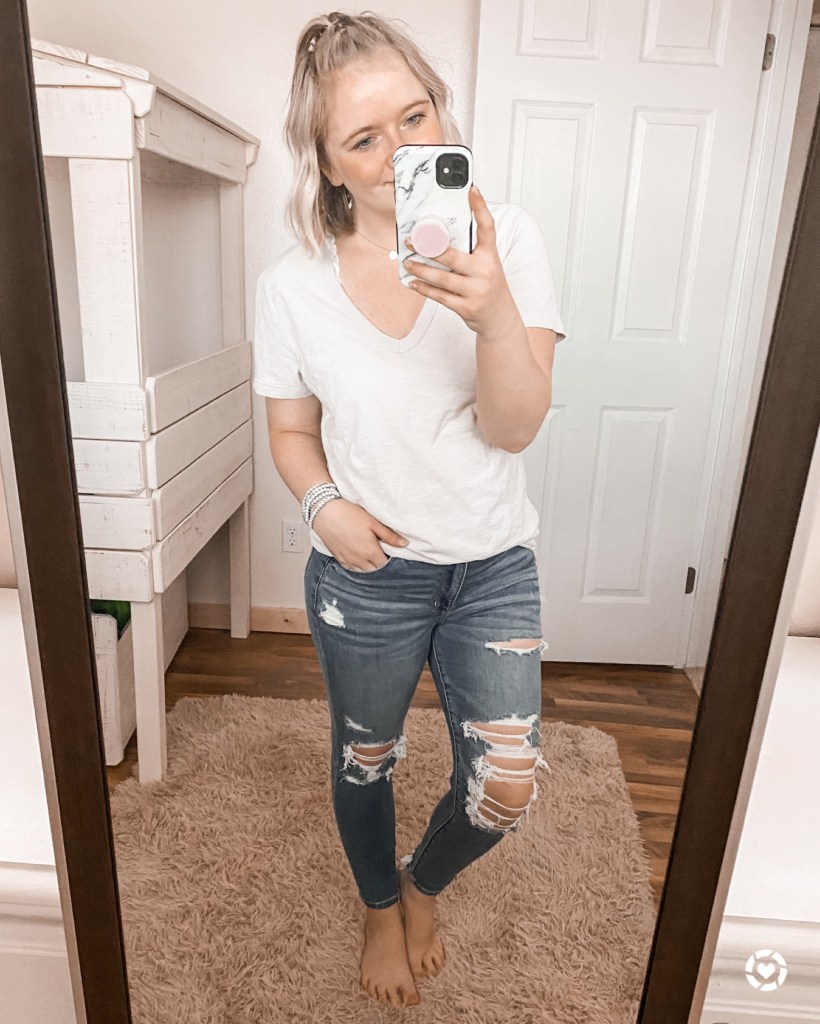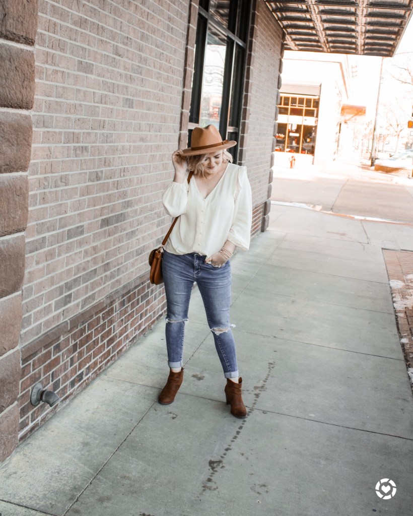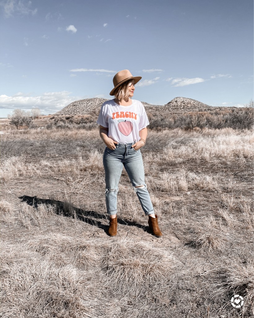 Tee // Mom Jean // Booties // Hat // Bracelet